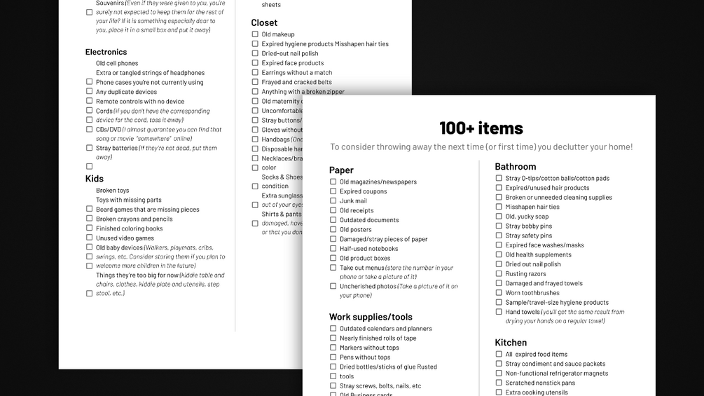 ✔ 100 Items to Declutter — A helpful guide with everyday examples like tangled cords, expired makeup, and old paperwork